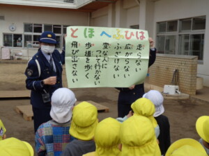 今日は交通指導員さんがもうすぐ小学生になる年長さんと小学生の保護者になるお母さんお父さんに交通安全教室を行ってくれました。
