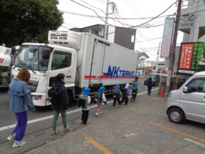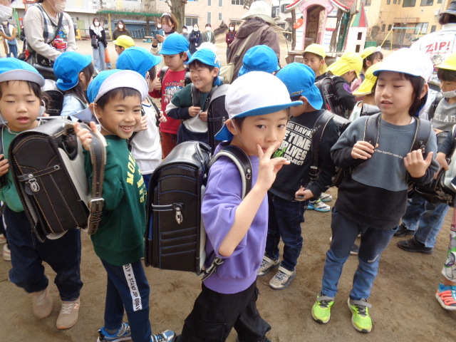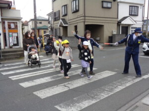 その後、小学生のようにランドセルをしょって、幼稚園の周りの道路を通学班になって歩いてみました。