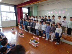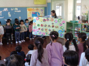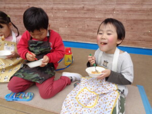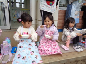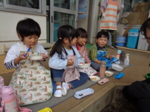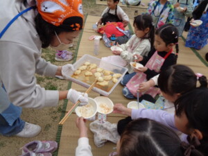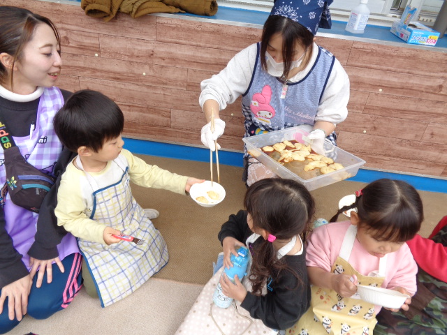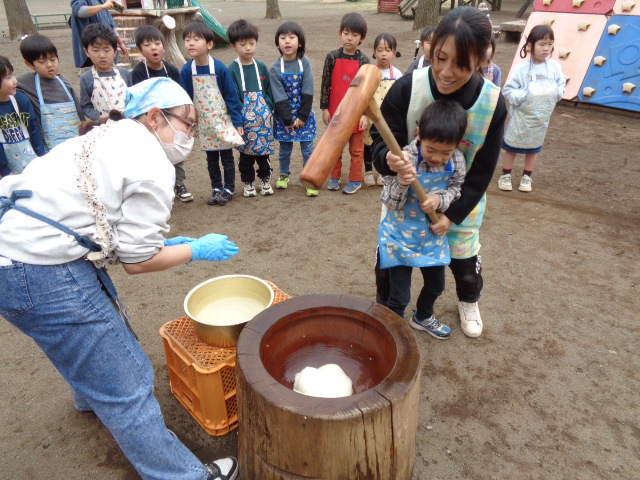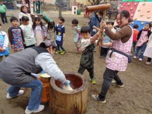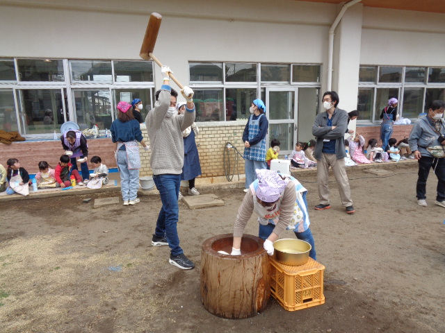 年長さんのお別れ会・おもちつきを行いました。 お別れ会では年長のお兄さんお姉さんと一緒に楽しくゲームを行いました。最後に年長さんのステキな歌も聞けました。 おもちつきでは、よいしょ!よいしょ‼と元気な掛け声の中、役員さんやお父さんの力を借りてもちつきをしました。 どの子もニコニコ笑顔で、おなかいっぱいお餅を食べることが出来ました。