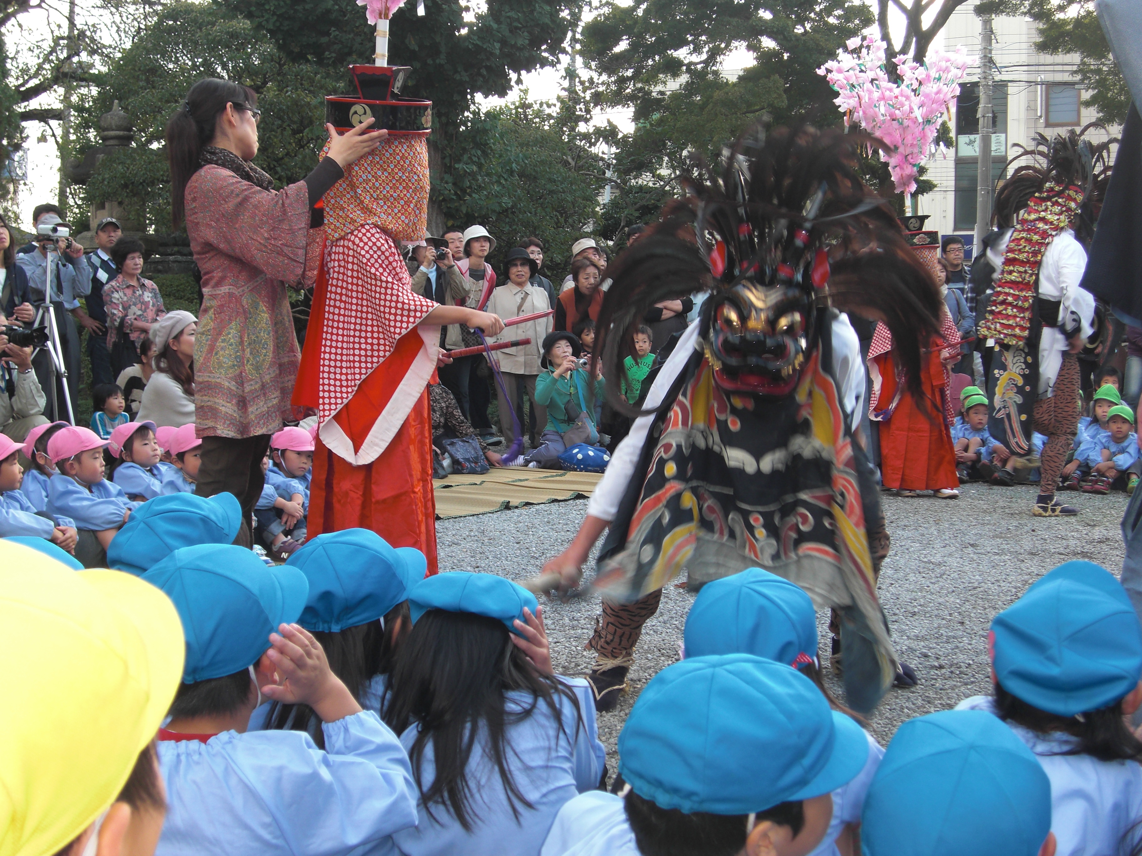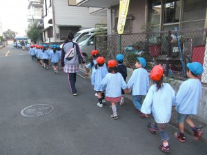 近所にある金剛院まで、秋のお祭り「入曽の獅子舞」をみんなで観に行きました。年長のお兄さんお姉さんが下の子たちと手をつなぎ、みんなで散歩をしながら歩いていきました。普段なかなか観ることのできない地域の伝統行事を間近で見る貴重な経験ができました。でも、近くで見る獅子は迫力があり、ちょっと怖かったみたいです・・・