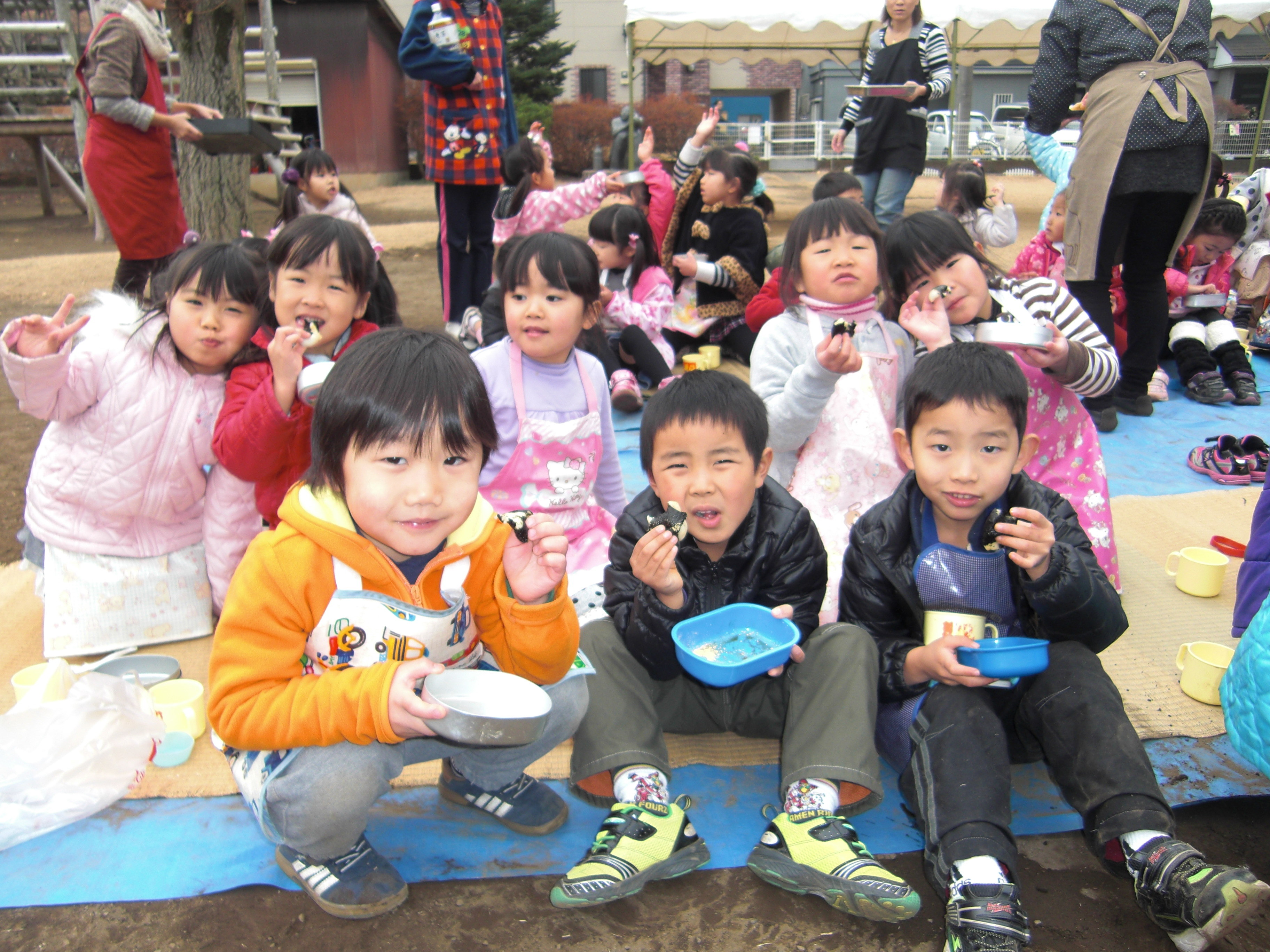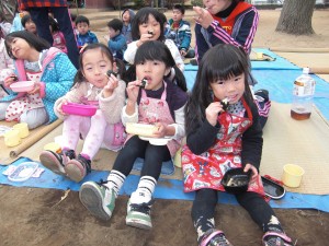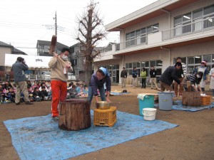 毎年恒例の『おもちつき』をしました。雨が心配されましたが、薄曇りの中、多くのお父さん・お母さんに協力していただき、楽しく餅つきを行うことができました。子どもたちは、つきたてホヤホヤのお餅を、さとう醤油・きなこ・海苔を巻いてと、おなかいっぱい美味しく食べることができました。