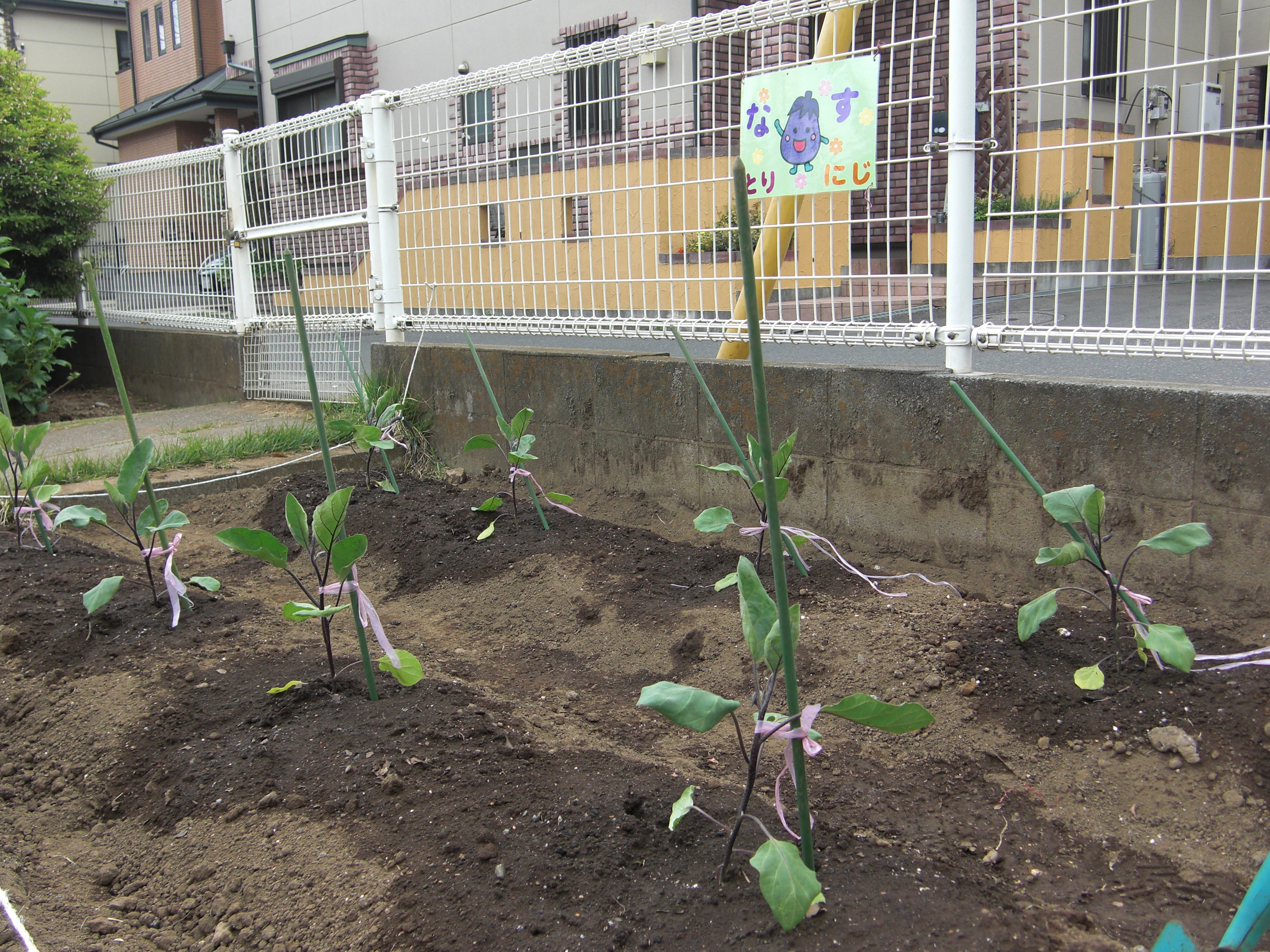 幼稚園の園庭の花壇に年少さんがナスの苗を植えました。