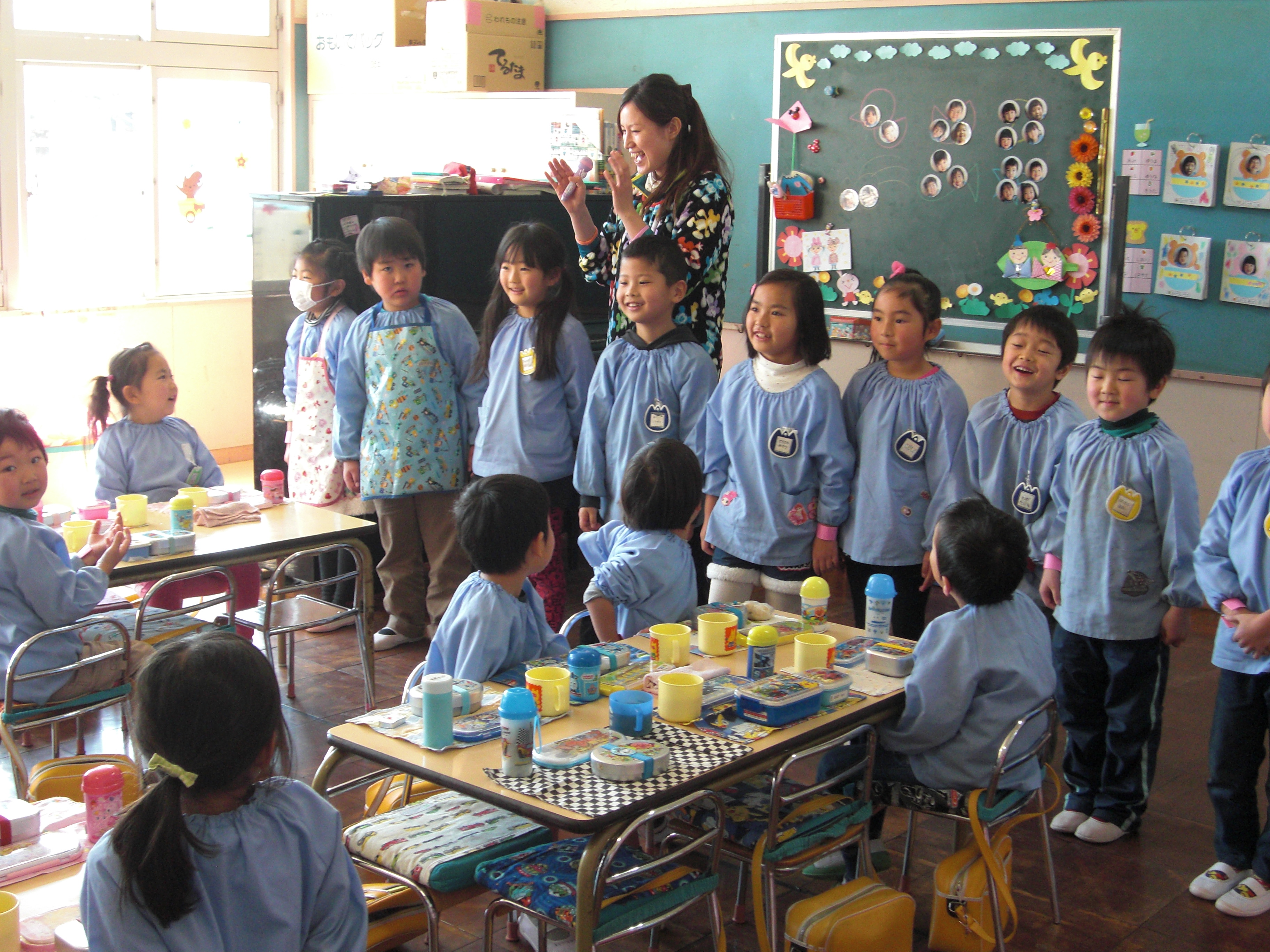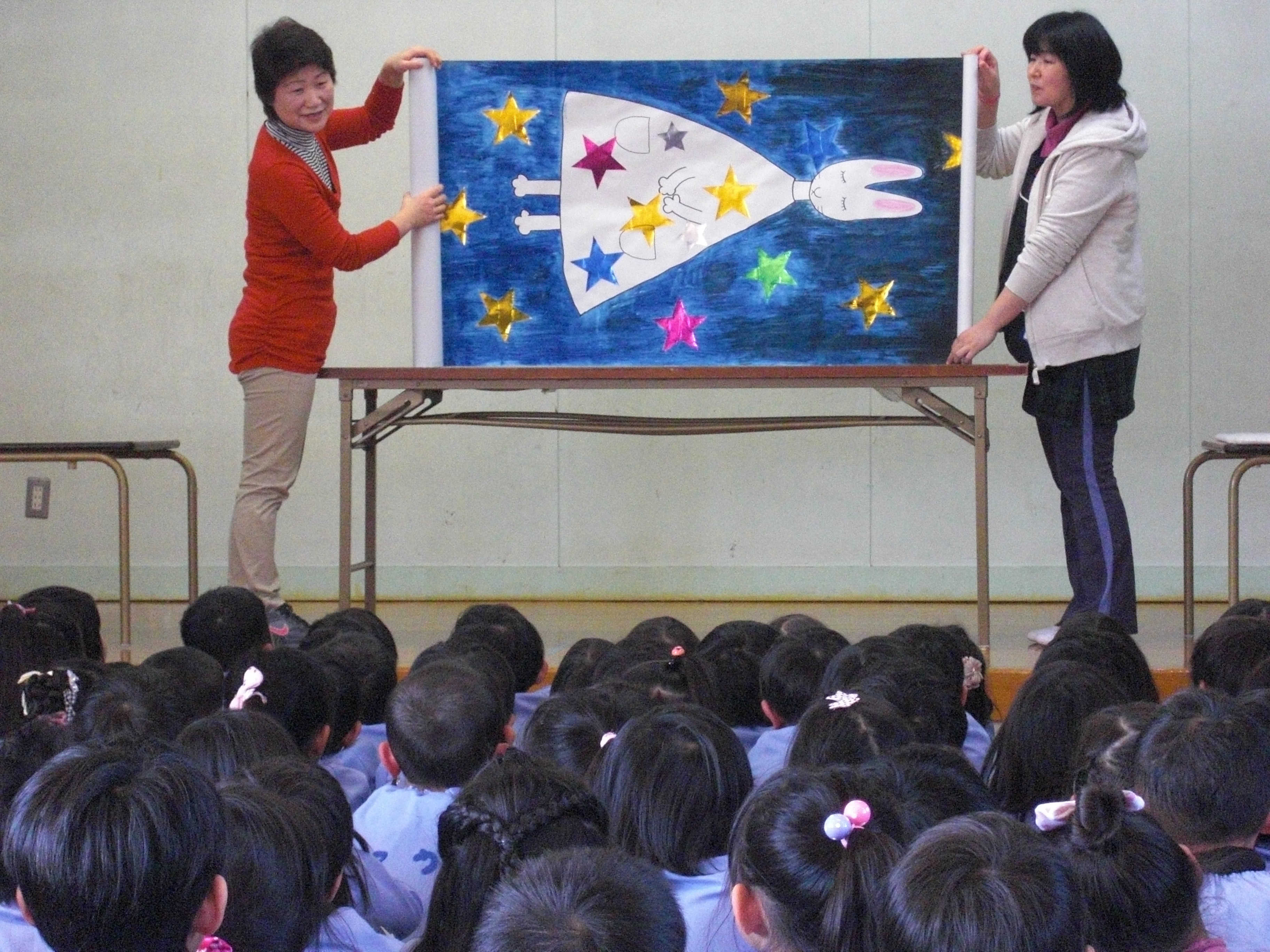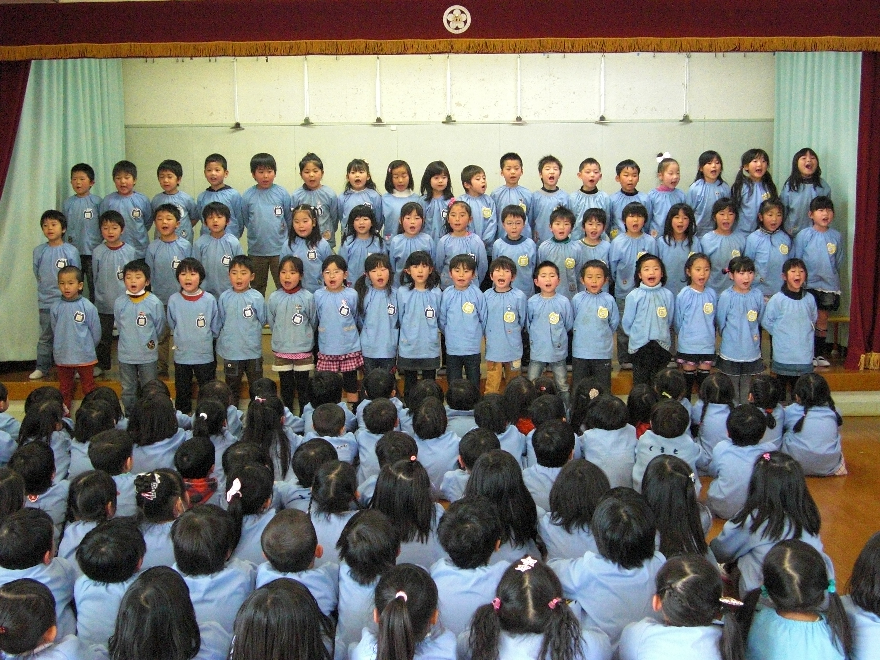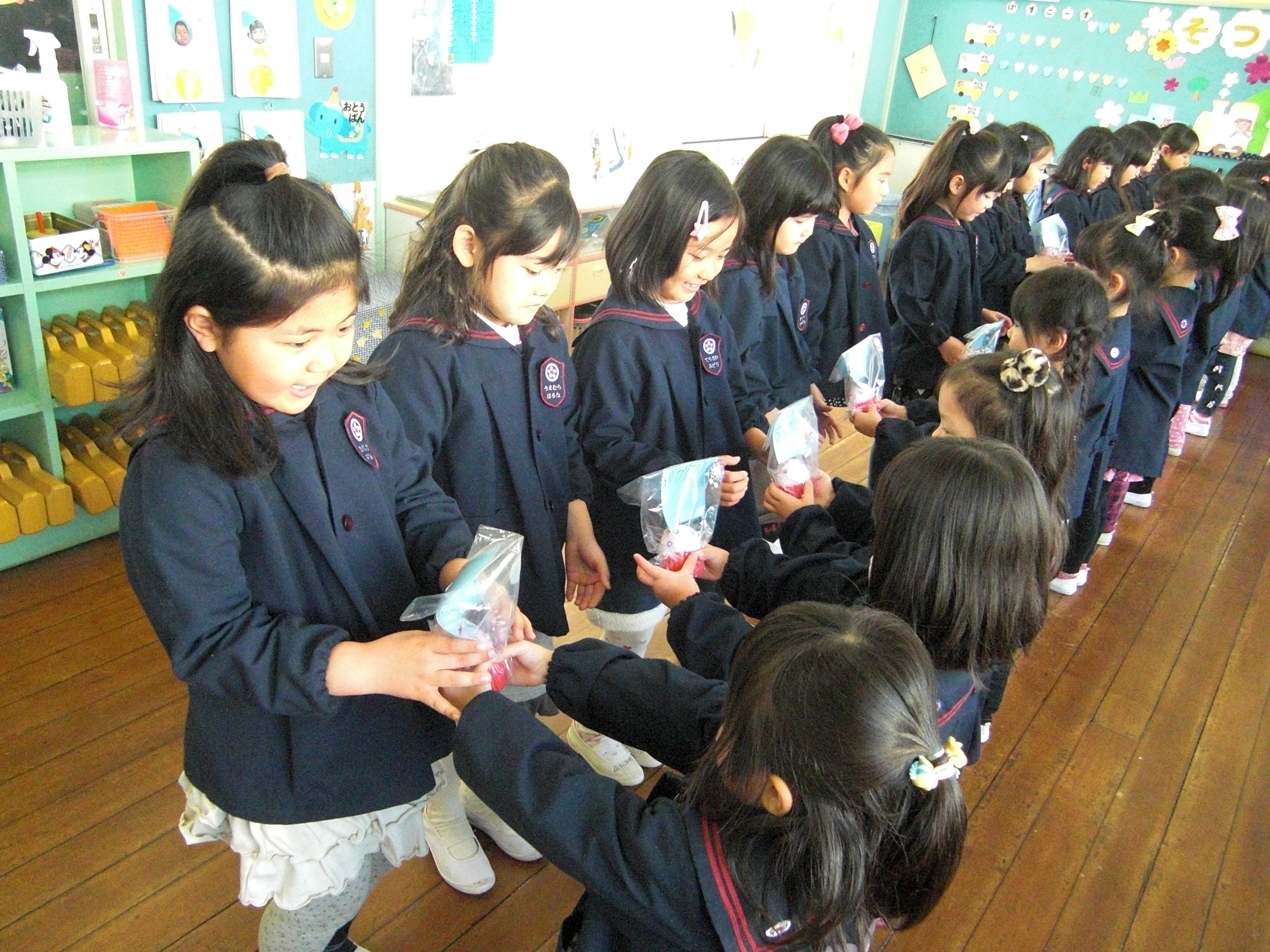 今日は、みんなで年長さんのお別れ会をおこないました。以前幼稚園に勤めていただいていた寺尾町子先生(旧姓牧野)をお招きし、楽しいパネルシアターを見せていただいたり、幼稚園のお友だち全員でゲームをしたり、縦割りクラスでお弁当を食べたりと、楽しいひと時を過ごせました。最後に年中さんからプレゼントをもらい、年長さんのどの子もうれしそうな顔をしていました。