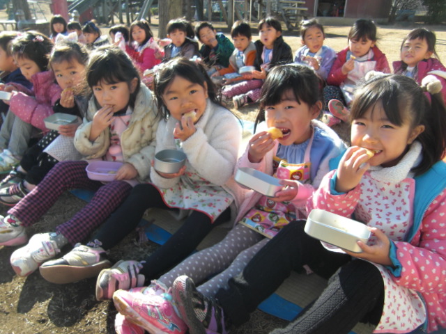 年末恒例のおもちつきを園庭でしました。こどもたちの「よいしょっ!」の声援の中、お手伝いのお父さんがお餅をつき、お母さんが手返しをしてくれました。 子どもたちは役員のお母さんたちと自分の好きな味付けをして食べたり、できたてのお餅をもらって食べたりと、おなかいっぱい食べていました。おうちに帰ってお昼ごはん食べれるかな?
