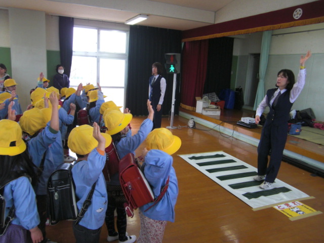 雨で実際の通学路を使っての練習はできませんでしたが、幼稚園内を通学路に見立て行いました。
