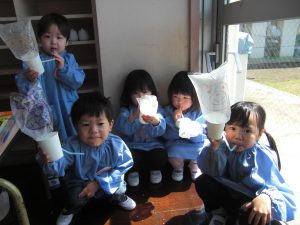 お母さんとはなれて、はじめてひとりでの幼稚園。はじめてのお友だち。はじめての先生。はじめての遊び。はじめてのお着替え。はじめての体操。はじめての英語。 色々なはじめてがあった一週間でした。はじめはドキドキでうまくできなくても、一日一日少しずつ上手になってきてますよ。