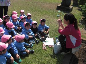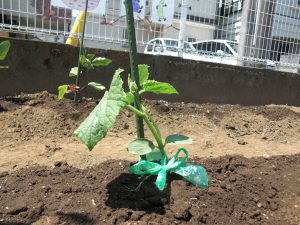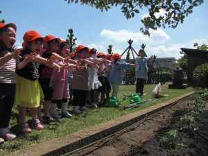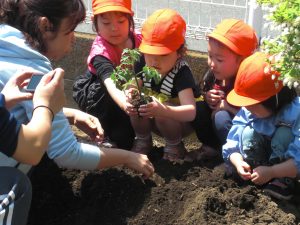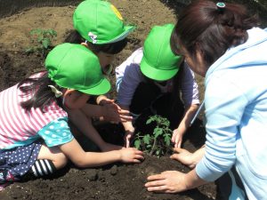 幼稚園の畑に年少さんがきゅうりとナス、年中さんがトマトの苗を植えました。 今のままだと葉っぱだけで何だかよくわからないけど、毎日水をあげてしっかりお世話をすれば、みんなのよく知っている実がいっぱいなるよ。がんばってね。