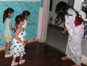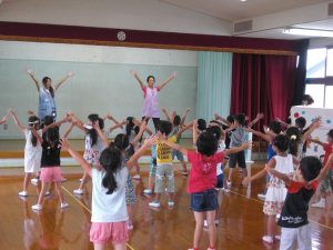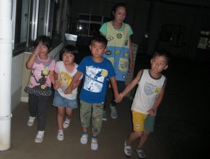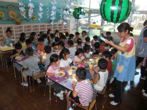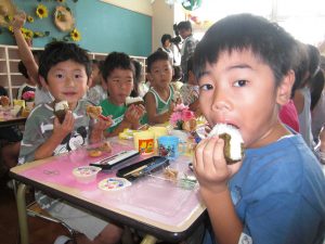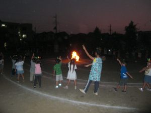 年長さんがお泊り保育をしました。 園庭でキャンプファイアーを囲んでみんなでダンスを踊ったり、うす暗い幼稚園の中をハラハラドキドキでおばけ探検したり、友だちの隣に自分で布団を敷いて一緒に寝たり、みんなで一緒にすまいるレストランでカレーライスやおにぎりを食べたり。 普段することのできない楽しい体験をいっぱいできました。 どの子も少し自身の付いたステキな顔でお家に帰ったと思います。