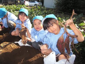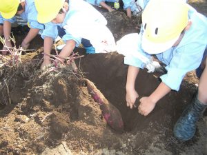 年長さんが春に幼稚園の畑に植えたサツマイモの収穫をしました。