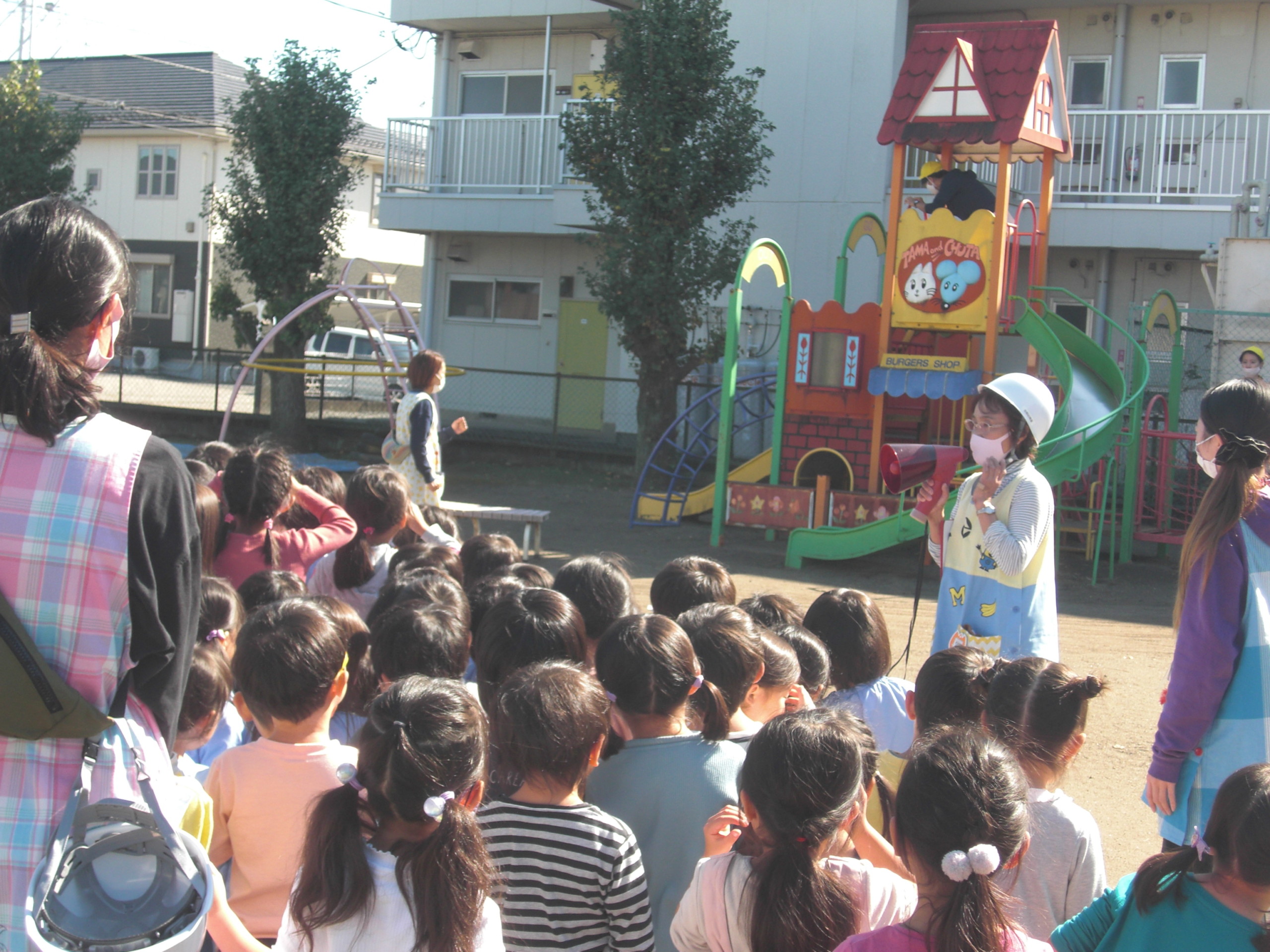 コロナの影響や悪天候で日程がずれてしまっていた園庭への避難訓練をようやく行うことができました。 園庭に避難してから、外で遊んでいる時の避難の仕方も練習してみました。 普段の楽しく遊んでいる時とは雰囲気が違い、少しピリッとした感じ。 けれど自分の命を守るための大事な活動です。どの子も真剣に先生の話を聞いていました。